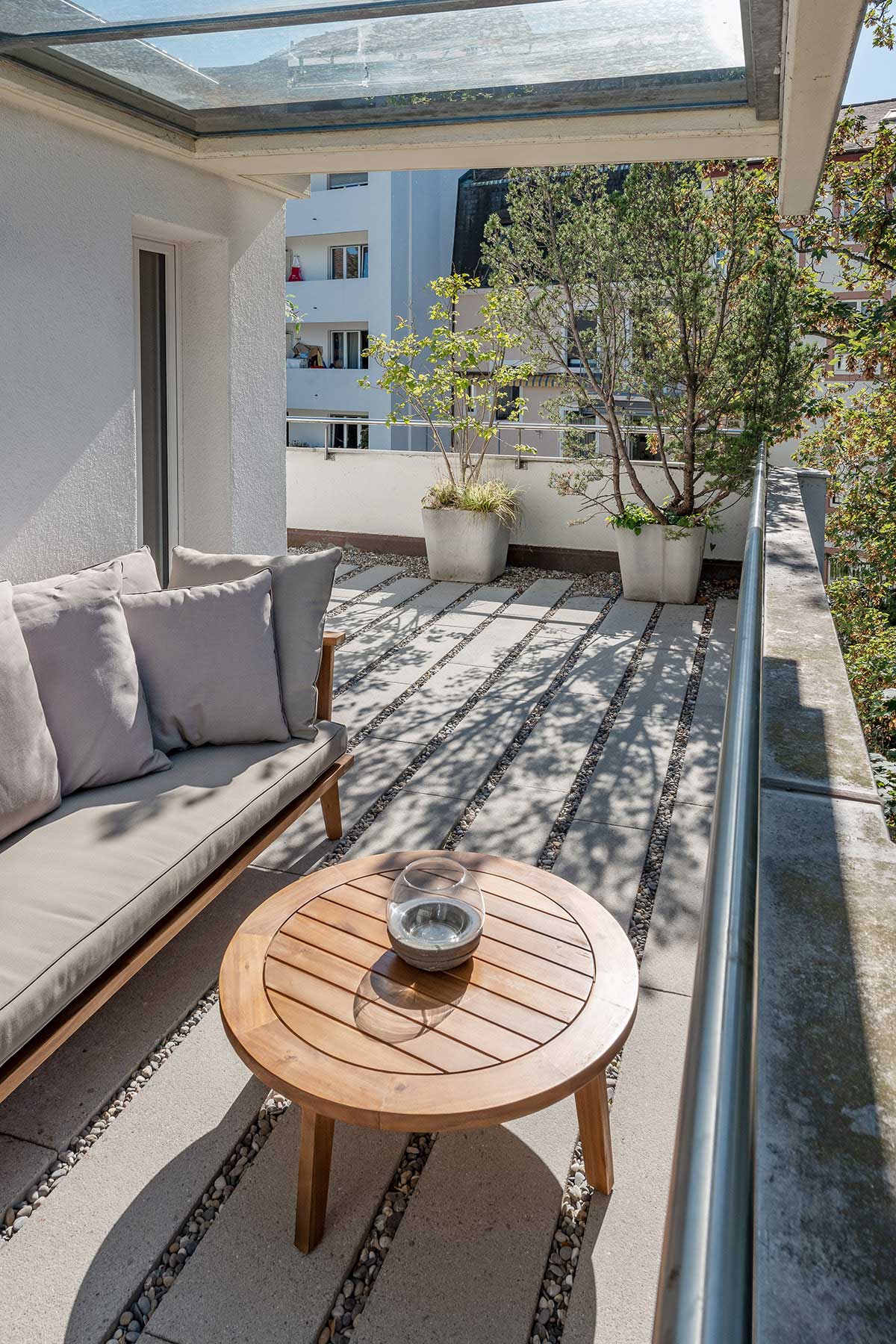 Wohnungsumbau in einem Basler Stadthaus: Mit sorgfältig arrangierten Details und dem umgestalteten Herzstück Terrasse ist eine grüne Oase mitten in der Innenstadt entstanden.