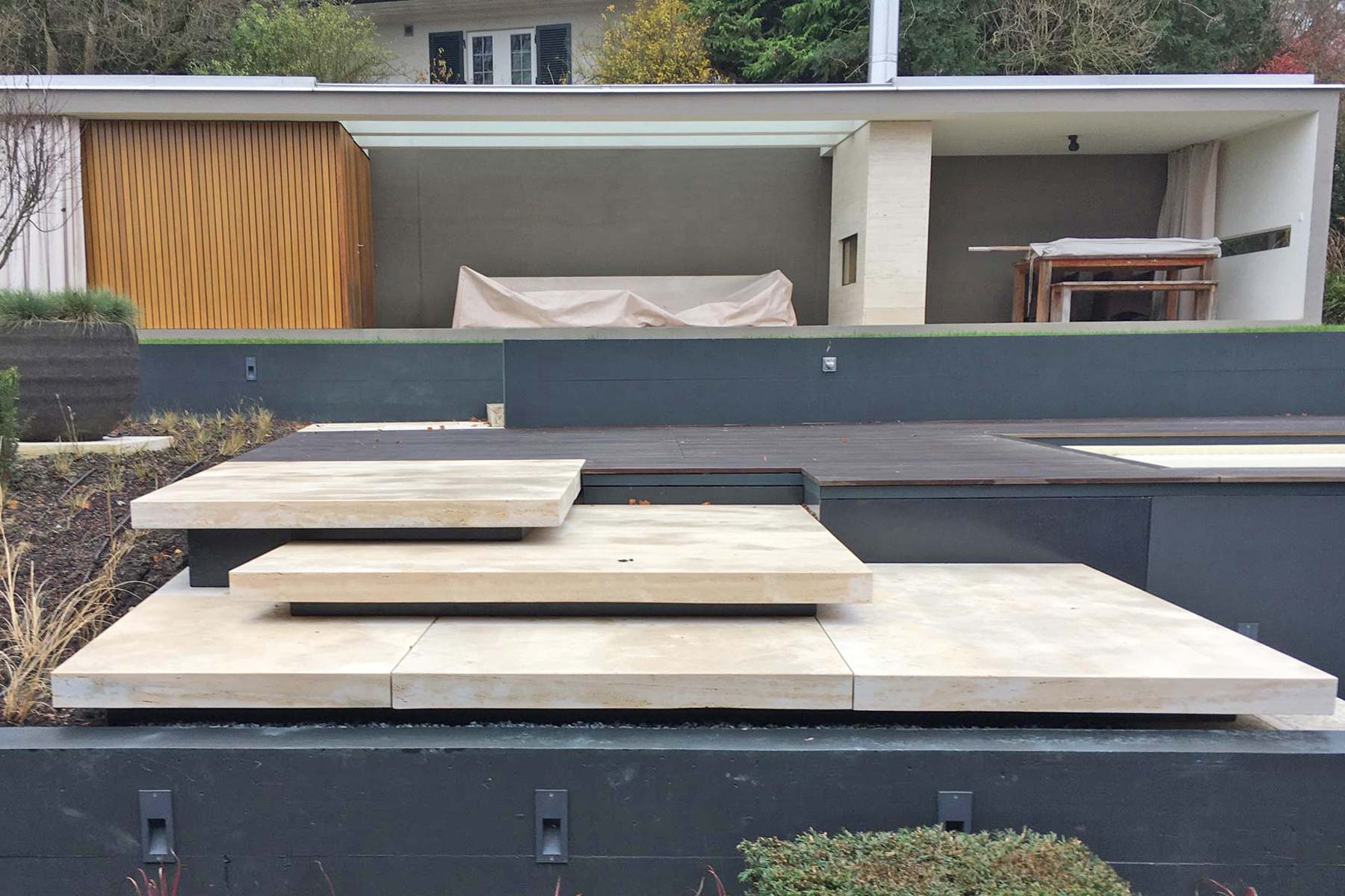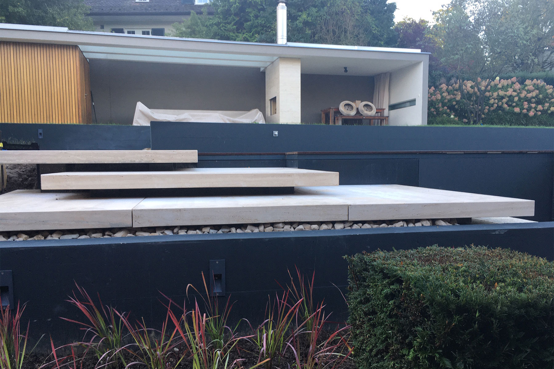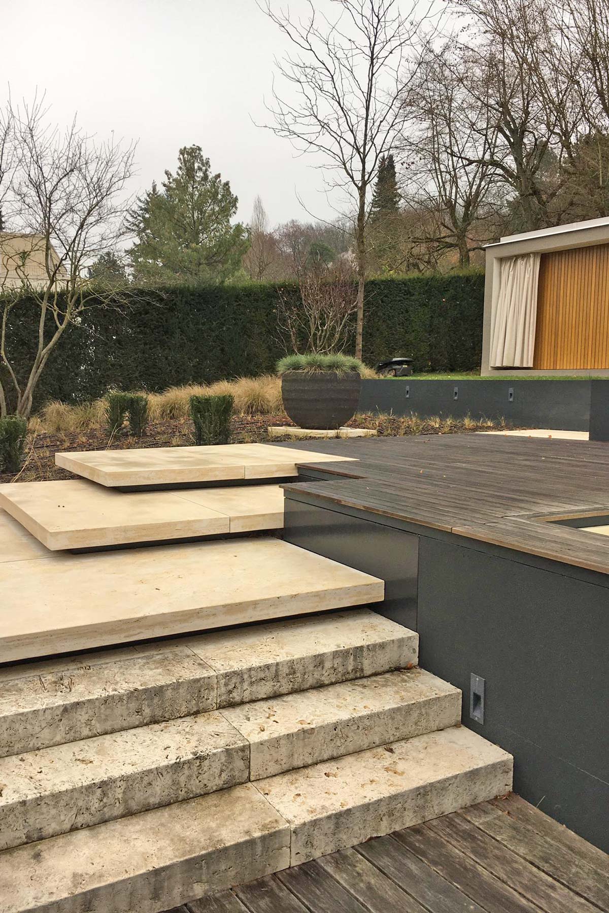 Die gross angelegte Pool Terrasse ist mit einem dunklen tropischen Holz bündig zum Poolrand erschlossen. Die Verbindung zwischen den verschiedenen Ebenen wird mit grossformatigen, schwebenden Travertin Stufen geschaffen. Diese fügen sich von der Charakteristik an die bestehenden Plattenbelege und den beiden bestehenden Cheminées ein.