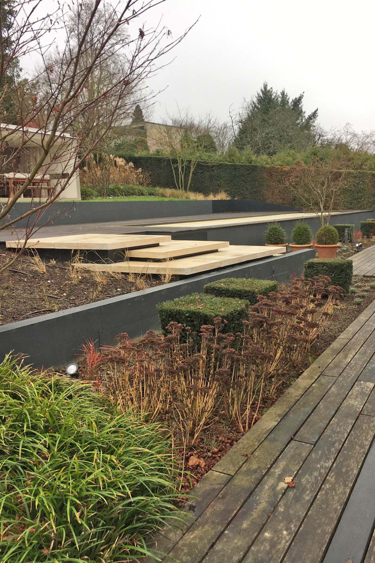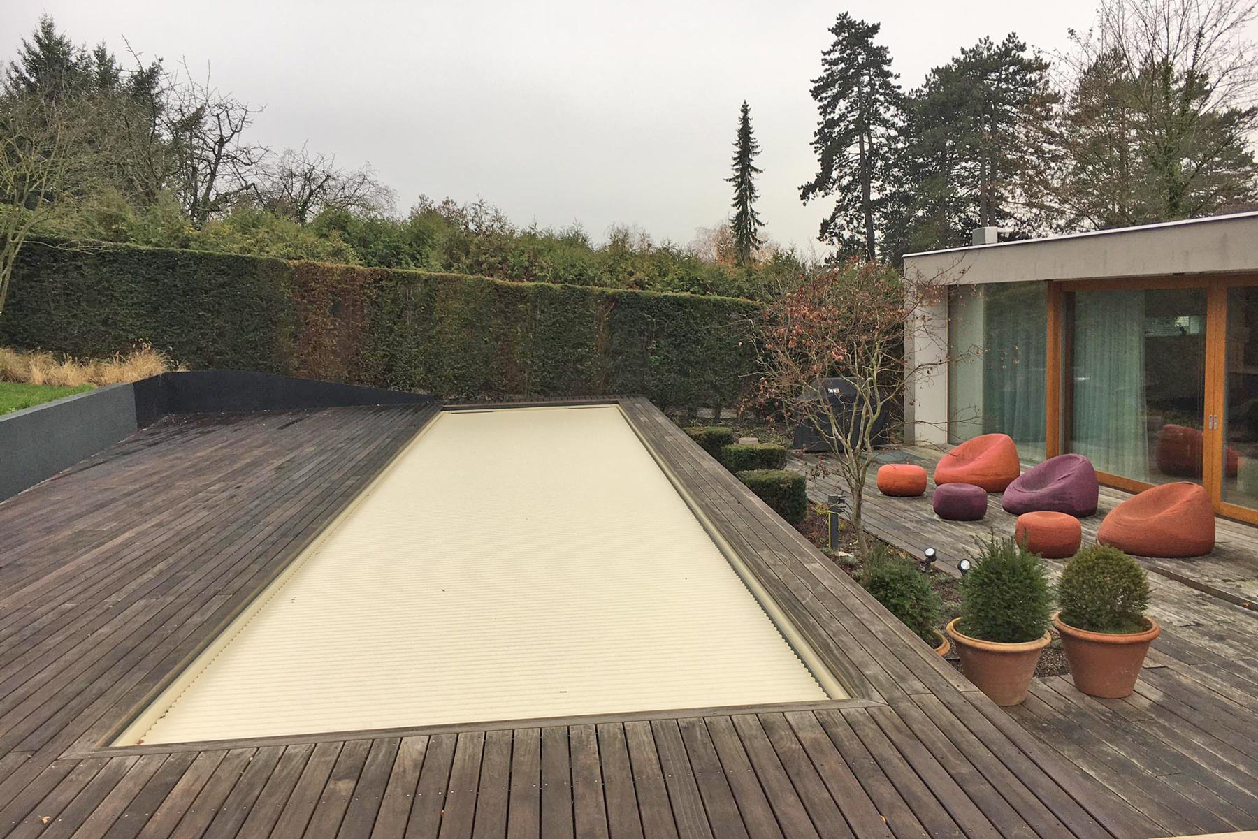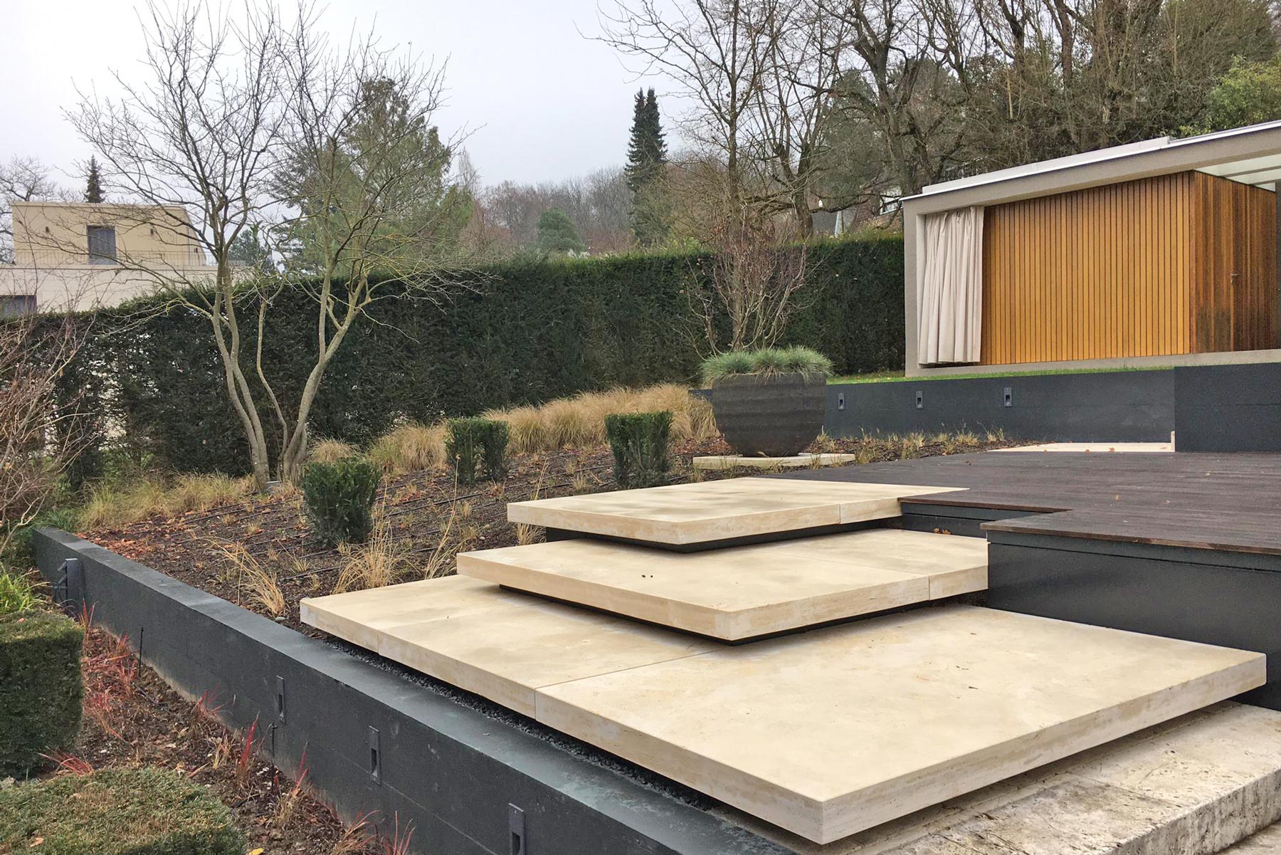 Die gross angelegte Pool Terrasse ist mit einem dunklen tropischen Holz bündig zum Poolrand erschlossen. Die Verbindung zwischen den verschiedenen Ebenen wird mit grossformatigen, schwebenden Travertin Stufen geschaffen. Diese fügen sich von der Charakteristik an die bestehenden Plattenbelege und den beiden bestehenden Cheminées ein.