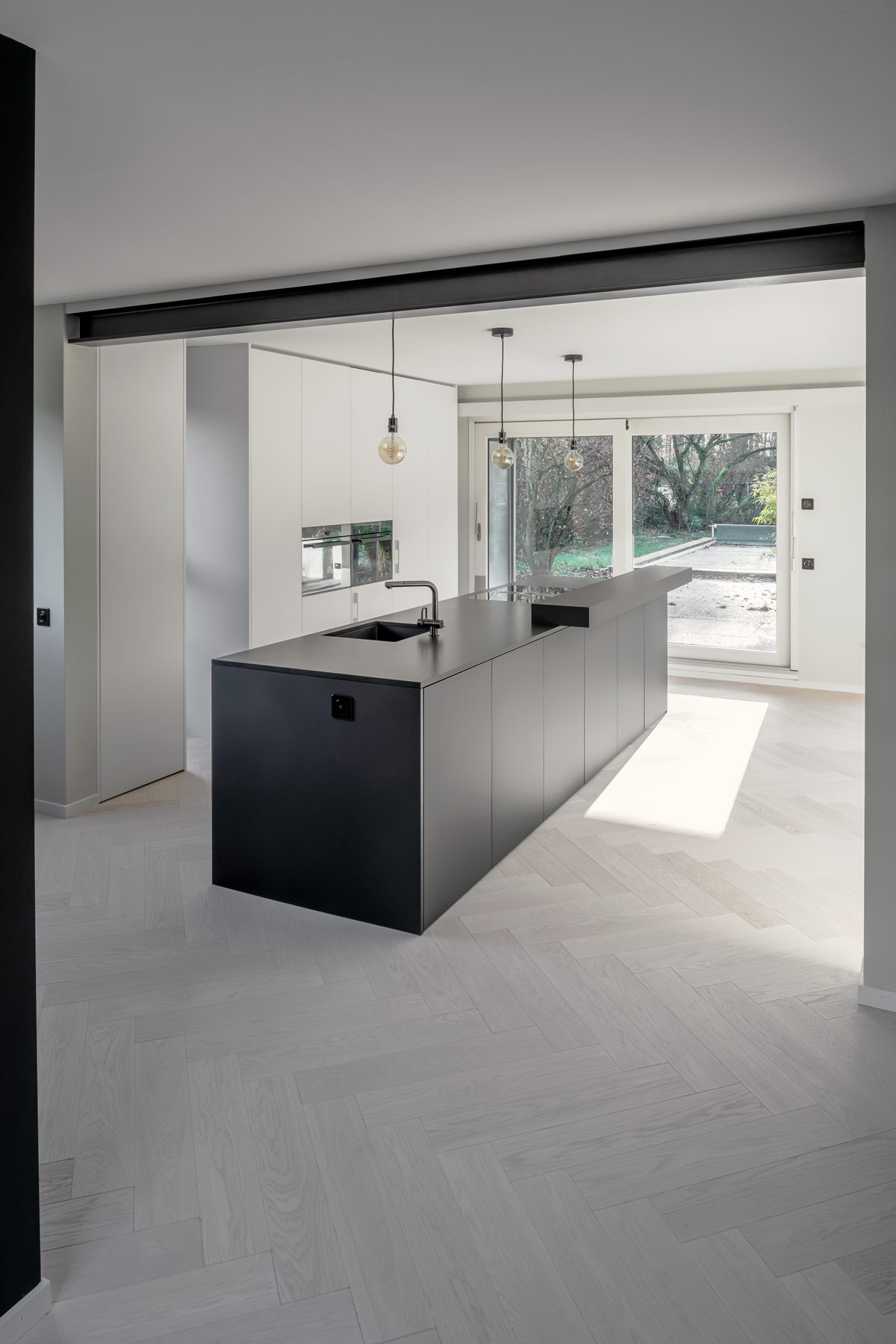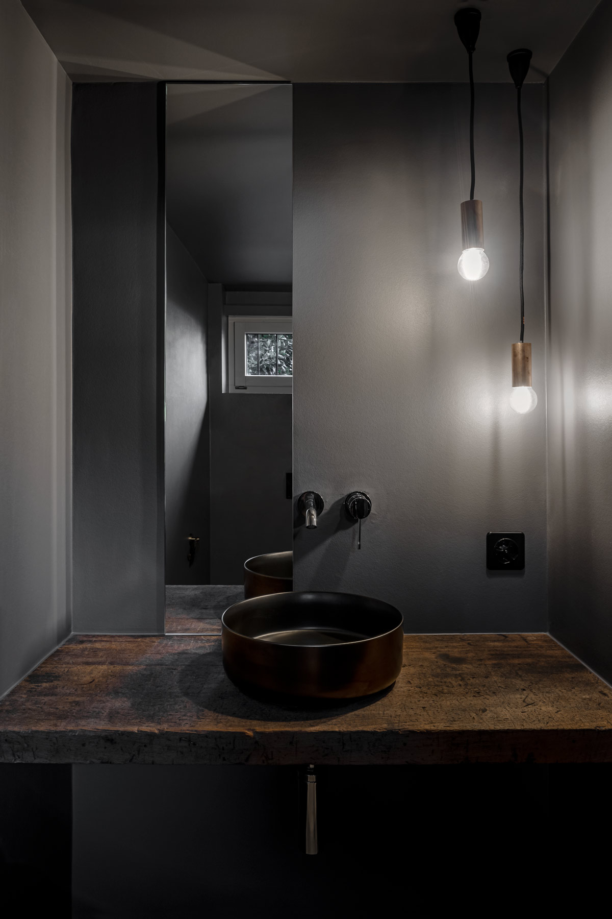 Die Küche besteht aus einem schwarzen Block mit einer weissen Rückwand, die zusätzlich als Funktionswand dient. Dahinter verbergen sich Wärmegeräte, Kühl- und Vorratsschränke. Das Gäste WC wollten die Kunden deutlicher in Szene setzen und so entschieden wir uns für eine eher dunkle Kammer, die mit ihrem Grau, Messing und Altholz Touch ebenfalls ein Highlight darstellt.