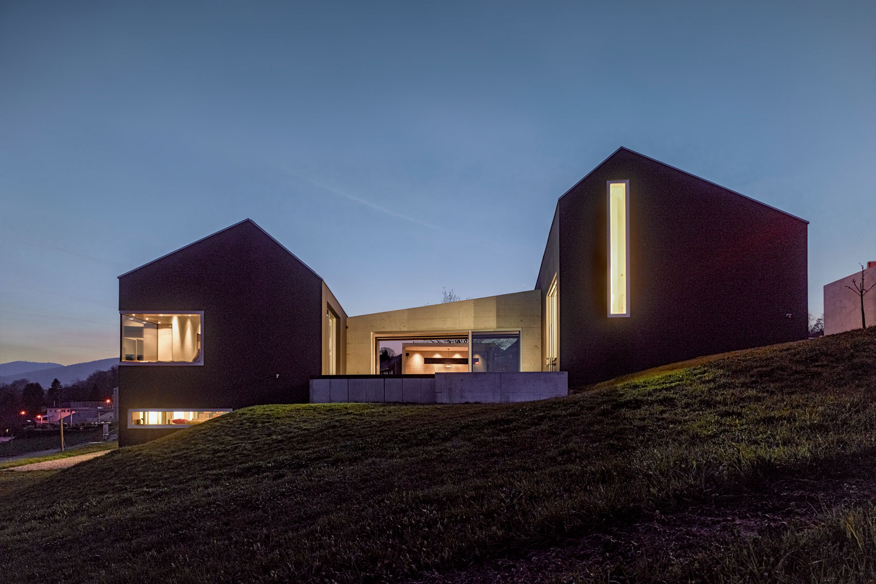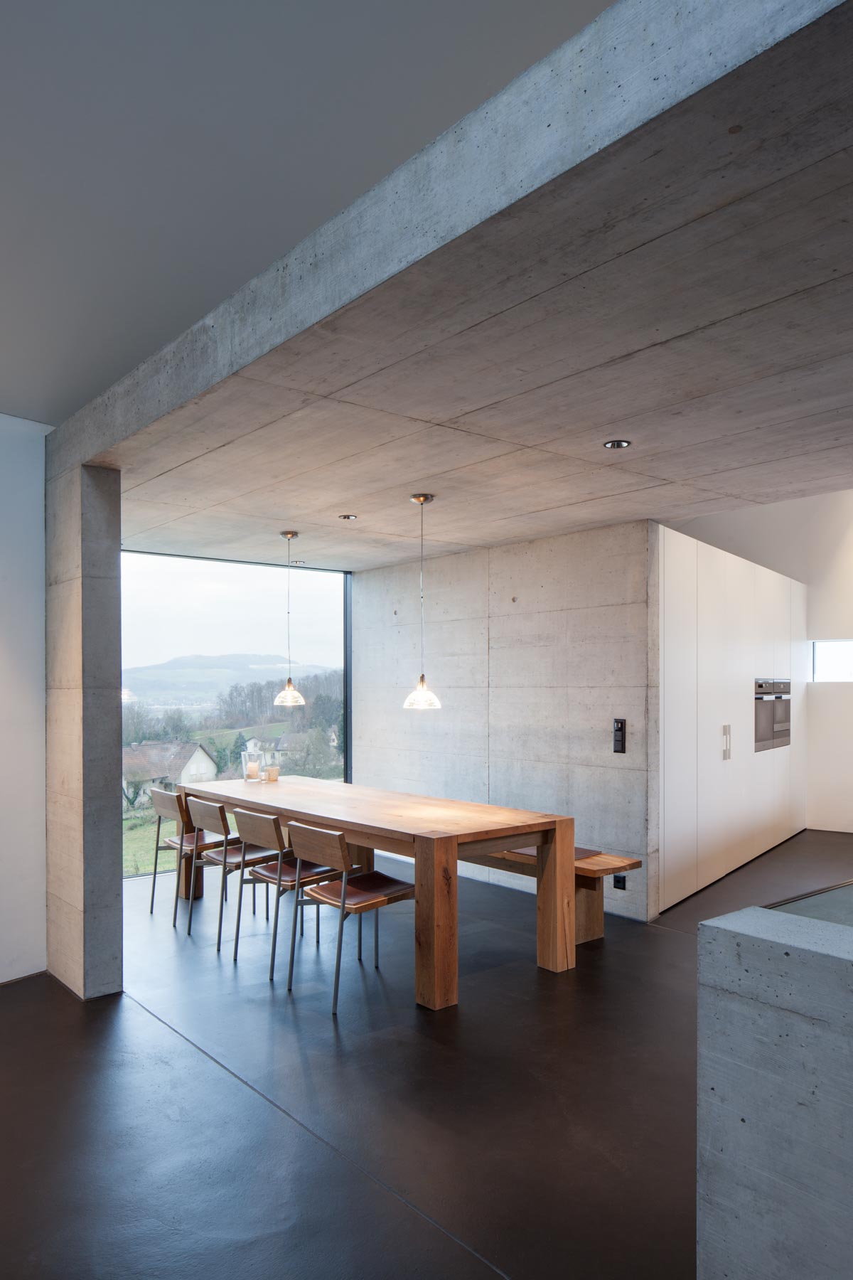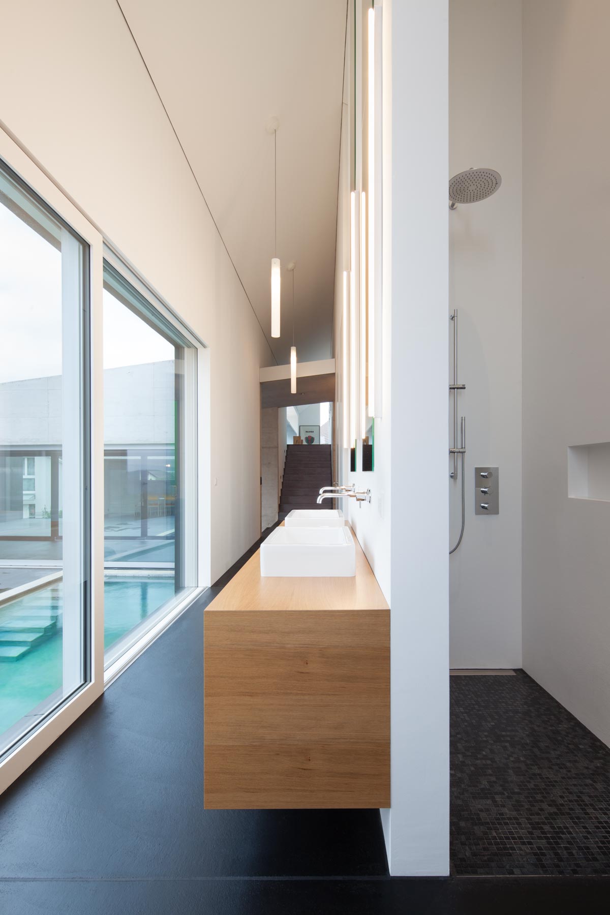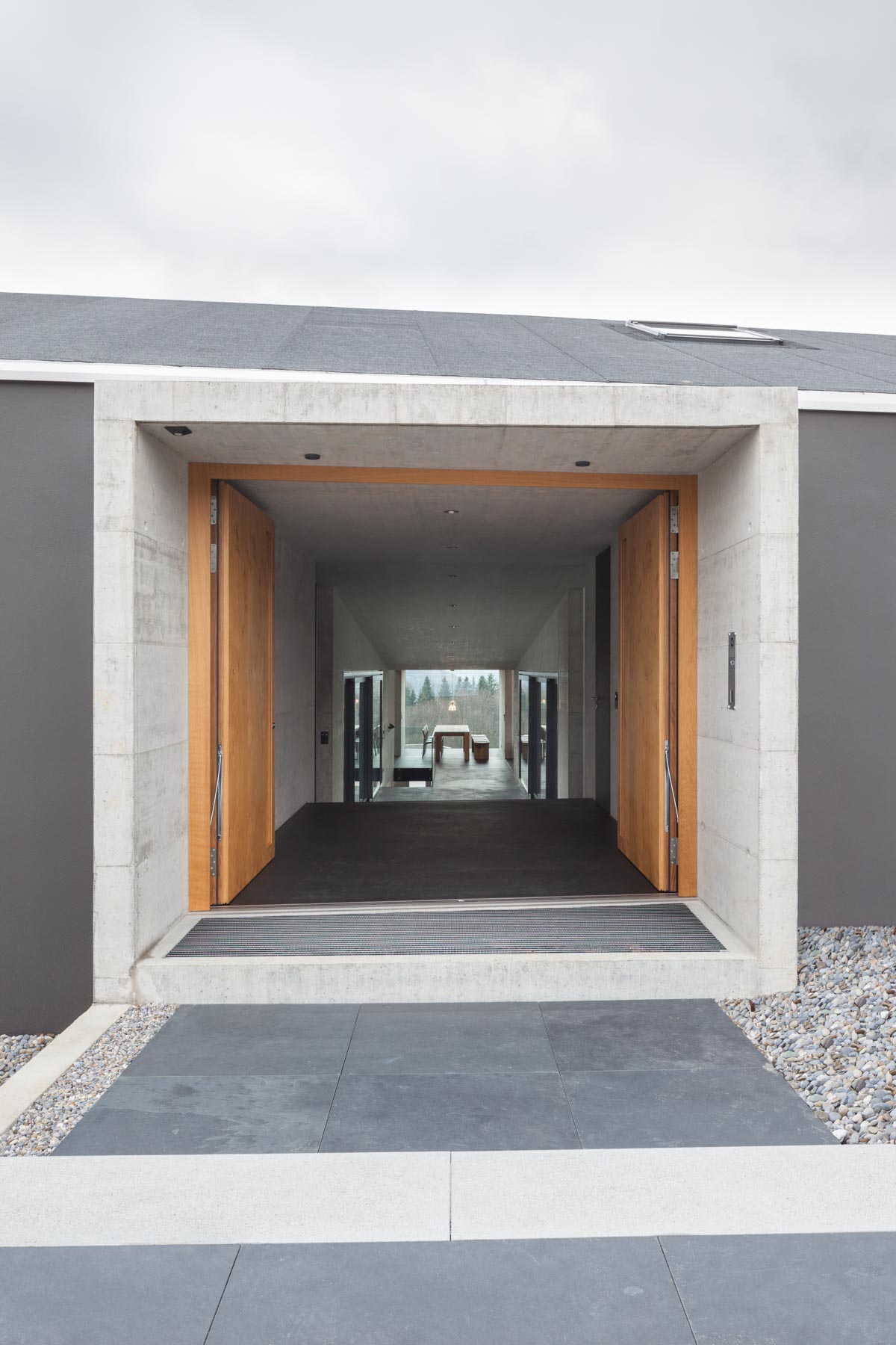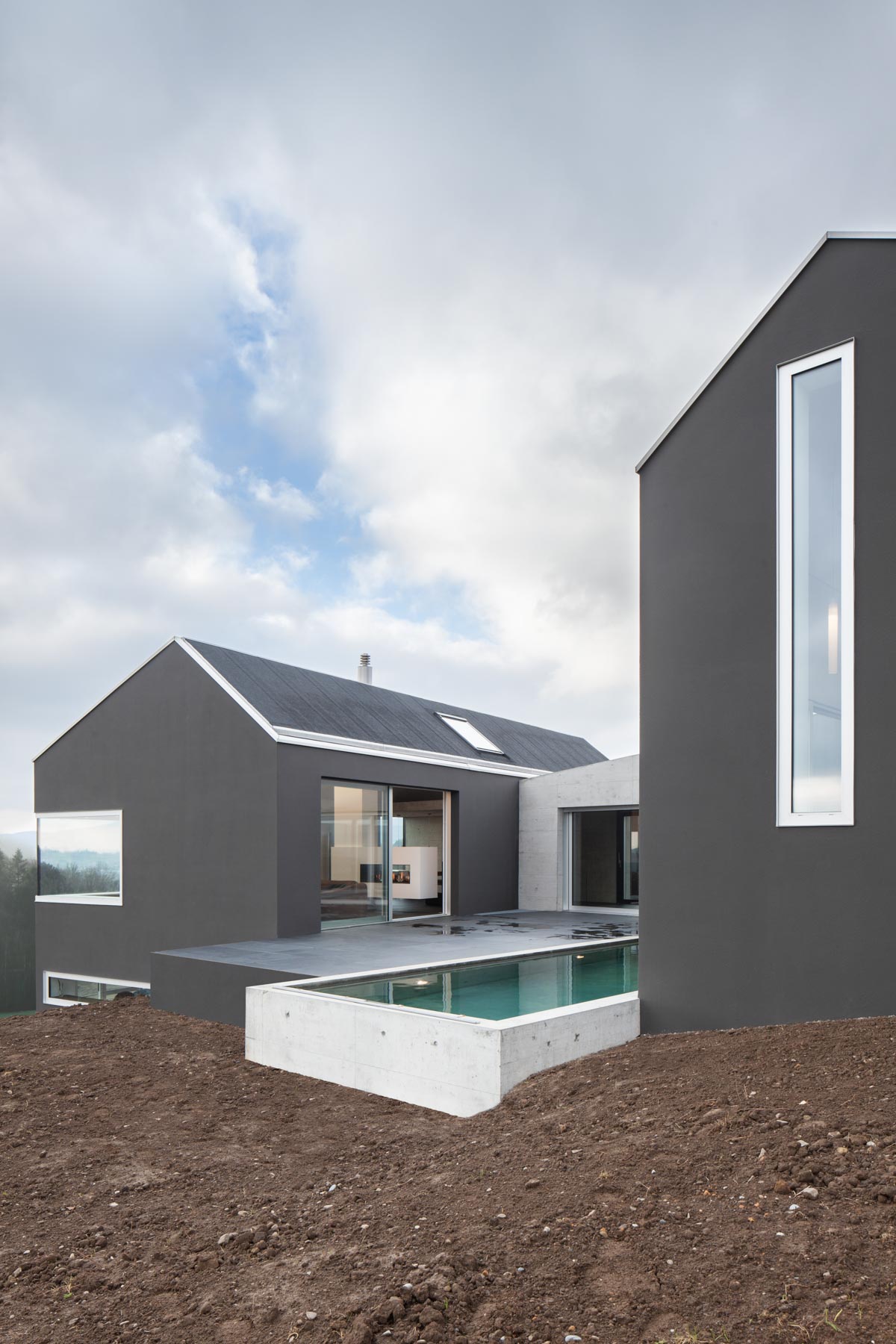 Breit wie ein Scheunentor und damit passend zur ländlichen Umgebung öffnet sich das moderne Familienhaus am Bözberg im Kanton Aargau. Der unerwartete Durchblick in die Ferne, aber auch die dunkle Fassade, die schwarz beschieferten Dachbahnen und die Proportionen des Hauses signalisieren, dass hier in einem ganz normalen Wohngebiet ein Stück aussergewöhnliche Architektur geschaffen wurde. Das Grundstück mit komfortablen 1200 Quadratmetern ist trapezförmig und öffnet sich am Hang wie ein Fächer nach unten. Dazwischen entfaltet sich der Aussenbereich. Das verbindende Element von Haus Nord zu Haus Süd ist der drei Meter breiter Korridor. Wie ein Vierkant schiebt sich das Sichtbetonelement durch die Bauwerke, trennt den Innenhof in zwei Teile und wirkt als Windschutz für den nach Osten liegenden Freiplatz mit dem zwölf Meter langen Pool.