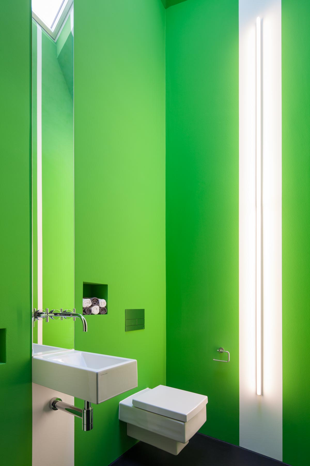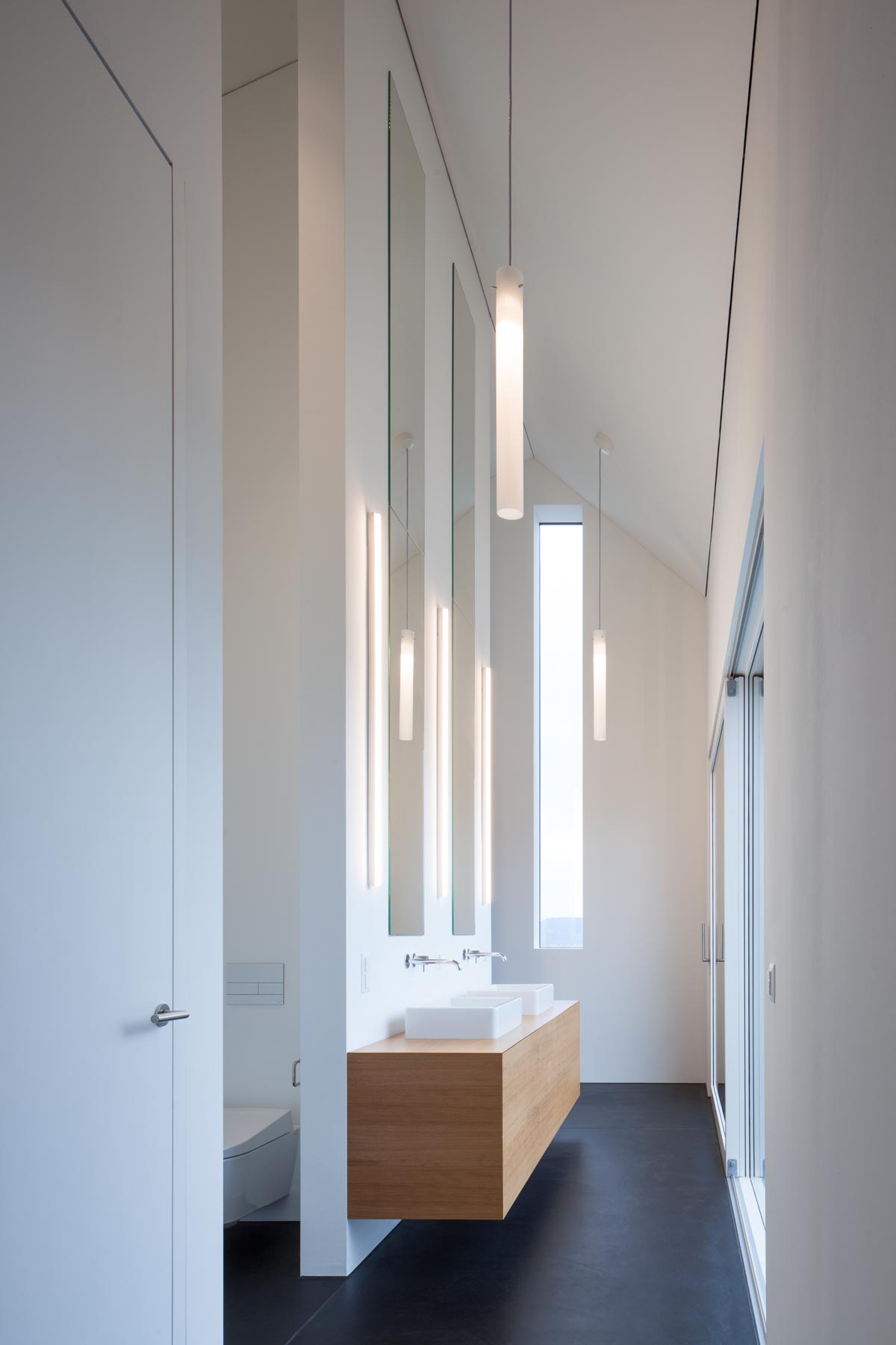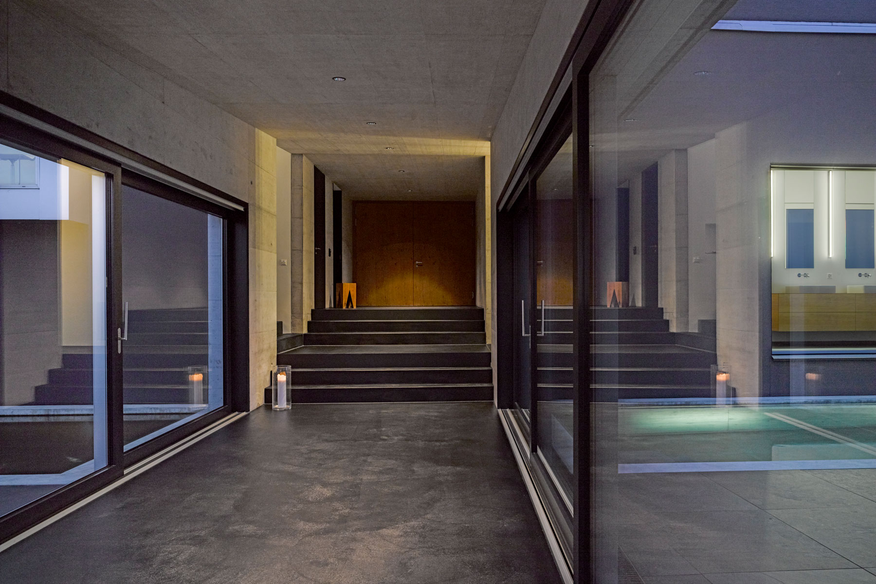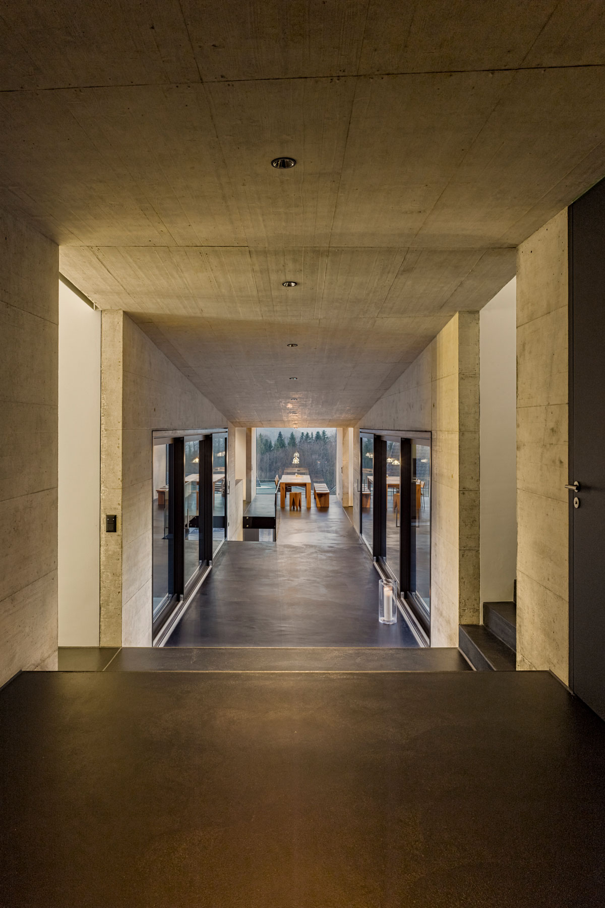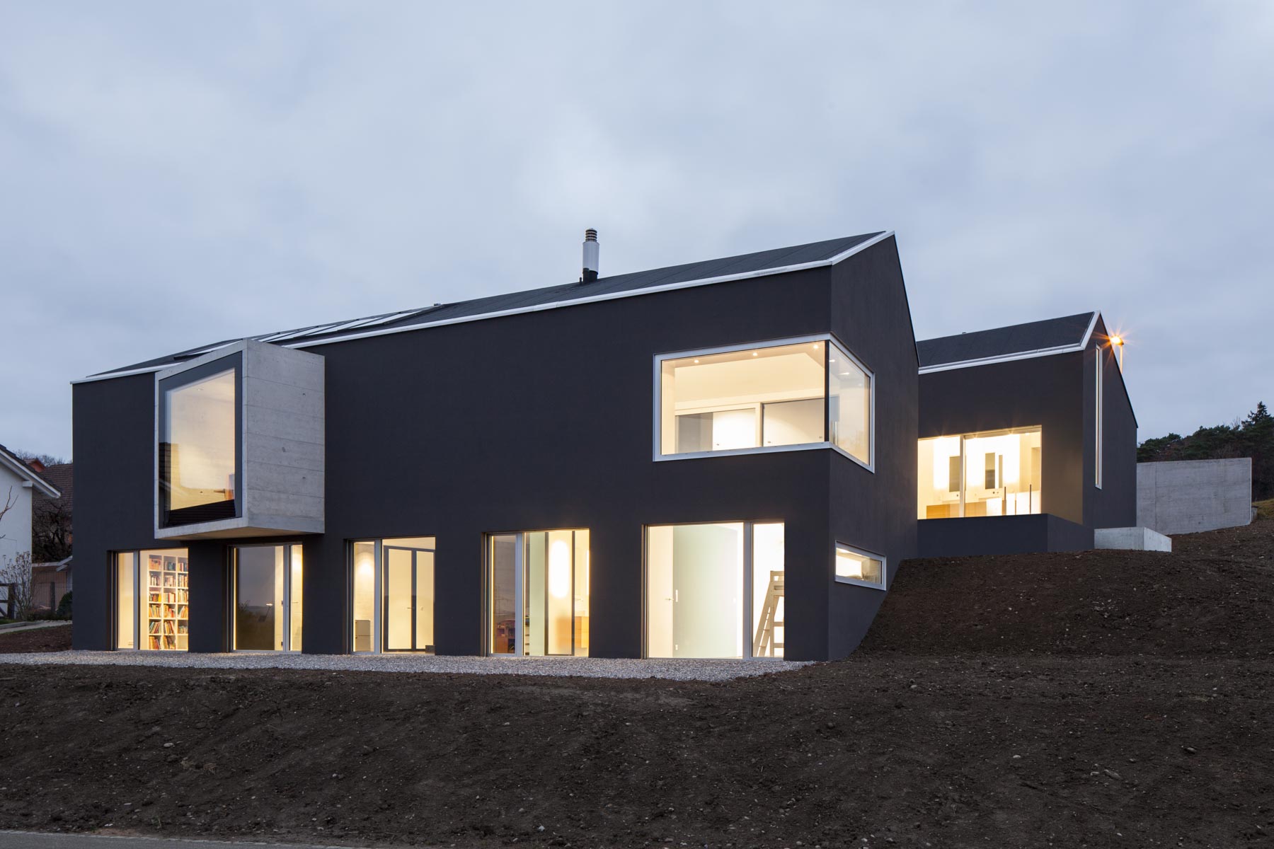 Breit wie ein Scheunentor und damit passend zur ländlichen Umgebung öffnet sich das moderne Familienhaus am Bözberg im Kanton Aargau. Der unerwartete Durchblick in die Ferne, aber auch die dunkle Fassade, die schwarz beschieferten Dachbahnen und die Proportionen des Hauses signalisieren, dass hier in einem ganz normalen Wohngebiet ein Stück aussergewöhnliche Architektur geschaffen wurde. Das Grundstück mit komfortablen 1200 Quadratmetern ist trapezförmig und öffnet sich am Hang wie ein Fächer nach unten. Dazwischen entfaltet sich der Aussenbereich. Das verbindende Element von Haus Nord zu Haus Süd ist der drei Meter breiter Korridor. Wie ein Vierkant schiebt sich das Sichtbetonelement durch die Bauwerke, trennt den Innenhof in zwei Teile und wirkt als Windschutz für den nach Osten liegenden Freiplatz mit dem zwölf Meter langen Pool.