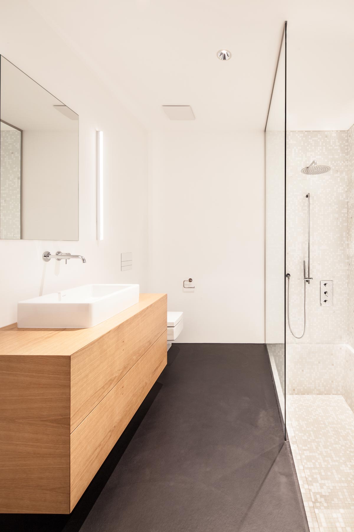 Die spiegelnde Fläche des Pools im Osthof setzt sich im Westen fort und bildet ein Teich für die Koikarpfen. In selben Hofteil befinden sich auch der überdachte Grillplatz und die Kräuterecke. Am südlichen ende des Korridors ist der grosse Esstisch, an dem die Familie einen grandiosen Ausblick auf die Alpen und dazu Sicht durch die Länge des Hauses geniesst. Angrenzend ist der Küchenblock mit der Chromstahlabdeckung, die Wohnlounge mit Bibliothek und Cheminée angeordnet. Im nördlichen Baukörper ist das Masterschlafzimmer der Eltern, eine Wohlfühl-Oase mit Bad und Sauna.